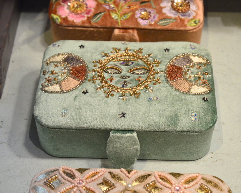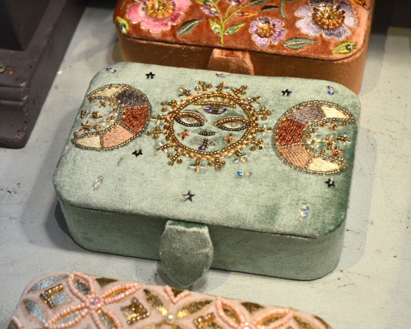 Het fluwelen doosje is aan de bovenkant geborduurd met een mooi zon- en maan patroon versierd met kraaltjes en glinsterende pailleten.