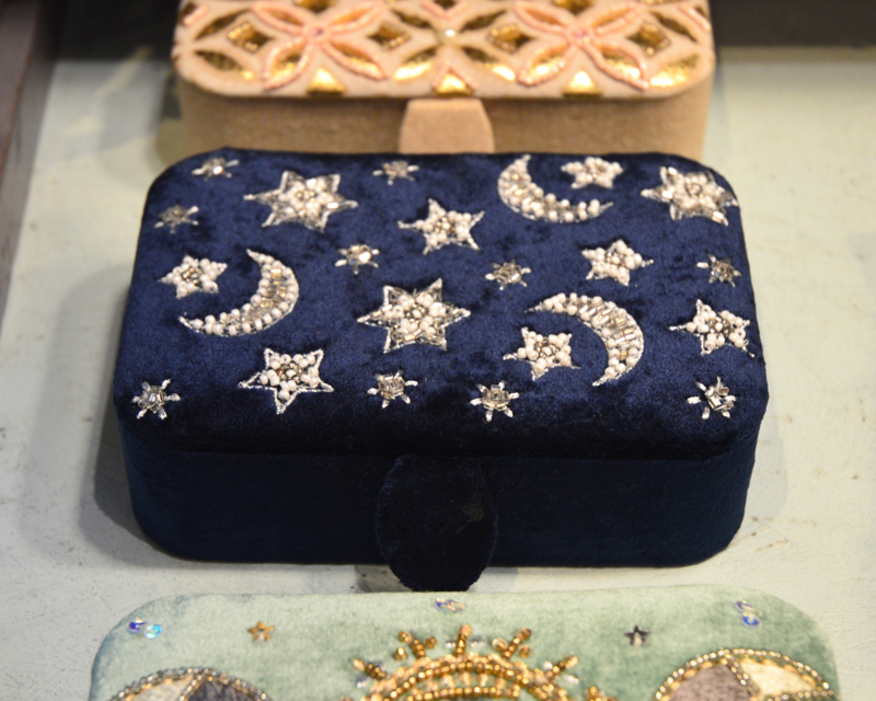 Het fluwelen doosje is aan de bovenkant geborduurd met een mooi sterren patroon en versierd met kraaltjes en zilver kleurige pailleten.